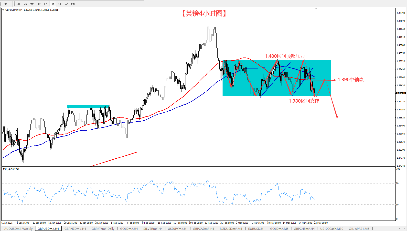 黄金上周未能乘势冲击1760而重新转为宽幅震荡走势,今天(3月22日)早盘我们在34位置挂的多单还没能进去,但也不是完全没有机会,如果没有就等到上方再做空。 值得注意的是,今天一早开盘金价就直冲50,目前回调至60均线附近,可见投资者已有对黄金押注的意图,这种行情多空都有机会,目前1小时图的均线系统运行