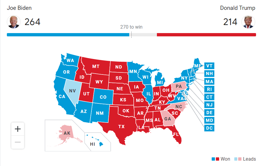 接下来,有三件事至关重要。 拜登一夜之间在威斯康星州和密歇根州完成反超,现在距离获胜只差6票,这个局面的确有点出乎意料。 现在再回过头来看,我们在昨天提到的两个可怕的结局,其中的第二种情况,好像比想象中更有可能出现了: 诉诸高等法院。 而这两天市场的走势,也和我们之前的预测