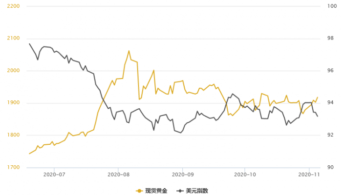 周四(11月5日)黄金T+D触底反弹逾1%,白银T+D收涨1%!现货黄金持续反弹,逼近60日均线水平,目前交投于1916.6美元/盎司,创两周新高,美元指数则跌向一周低位水平,从行情反馈来看,拜登如果当选利好黄金,特朗普连任则会打压金价。而日内拜登胜选的预期升温,因其优势正在扩大。胜负胶着的美国大选给美联储带来了压