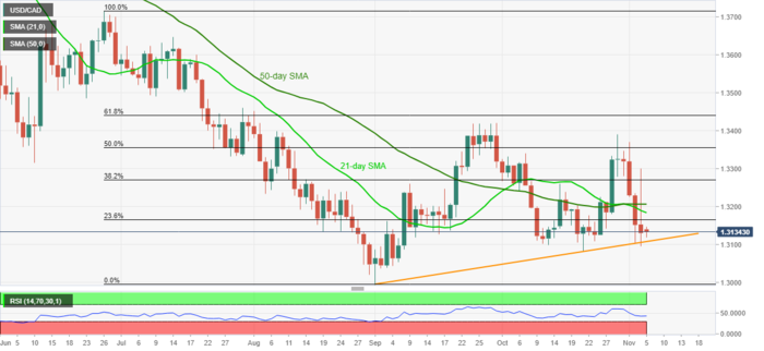 周四(11月5日)亚洲市场开盘后,美元/加元回落至1.3130。此前在纽约市场周三,美元/加元已经跌至10月21日以来的新低,但未能成功突破9月1日以来的向上倾斜趋势线。 不过,无法升穿21日和50日的A,加上没有超卖的RI条件,暗示价格将进一步下跌。 因此,看空美元/加元的人正在等待明确地突破支撑位1.31
