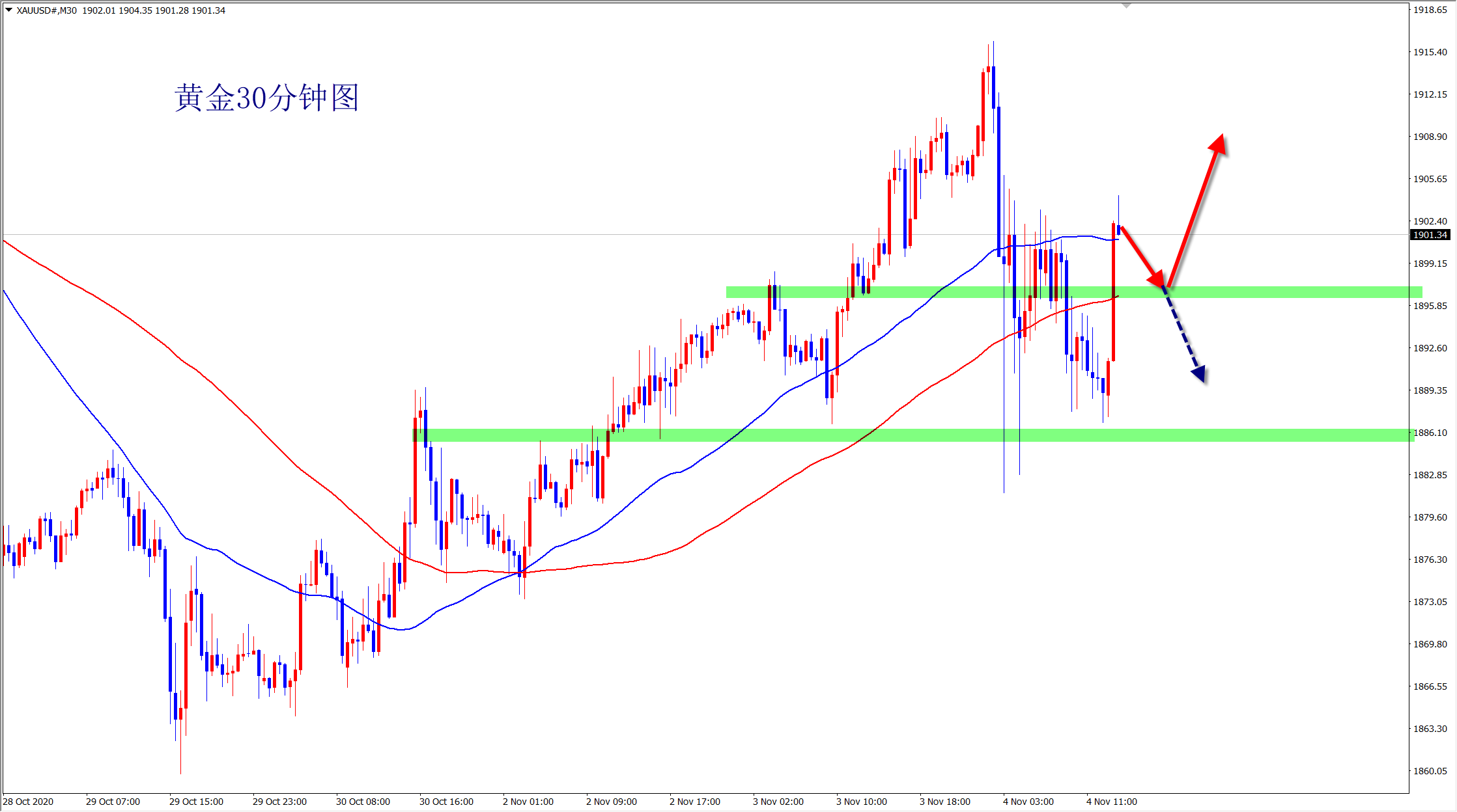 黄金早盘先涨后暴跌,最终在1880位置获得支撑,现在行情继续反弹,在大选结果没有准确公布前,不确定性仍会推动金价进一步走高!黄金美盘依托1896支撑看涨! 美国大选还有几个州没有公共结果,让原本清晰的选情更加扑朔迷离,甚至有诉诸官司的可能,在不确定的性的情况下,黄金作为最重要的避险资产,仍将继续
