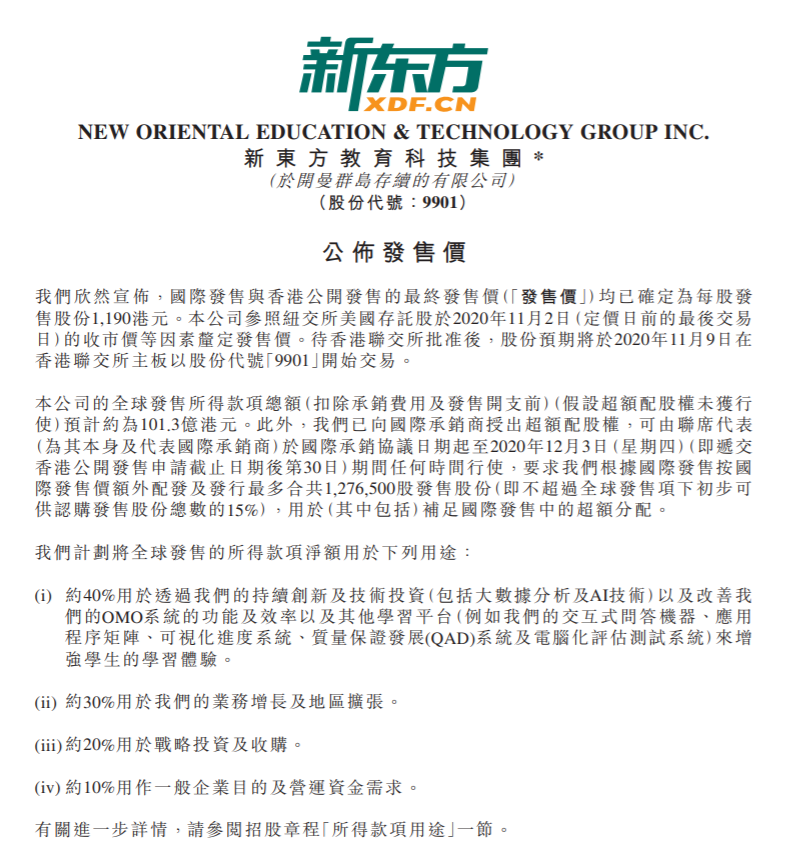 11月3日,新东方在港交所发布公告,宣布国际发售与香港公开发售的最终发售价均已确定为每股发售股份1190港元。参照纽交所美国存托股于2020年11月2日(定价日前的最后交易日)的收市价等因素厘定发售价。待香港联交所批准后,股份预期将于2020年11月9日在香港联交所主板以股份代号9901开始交易。全球发售所得款项总额