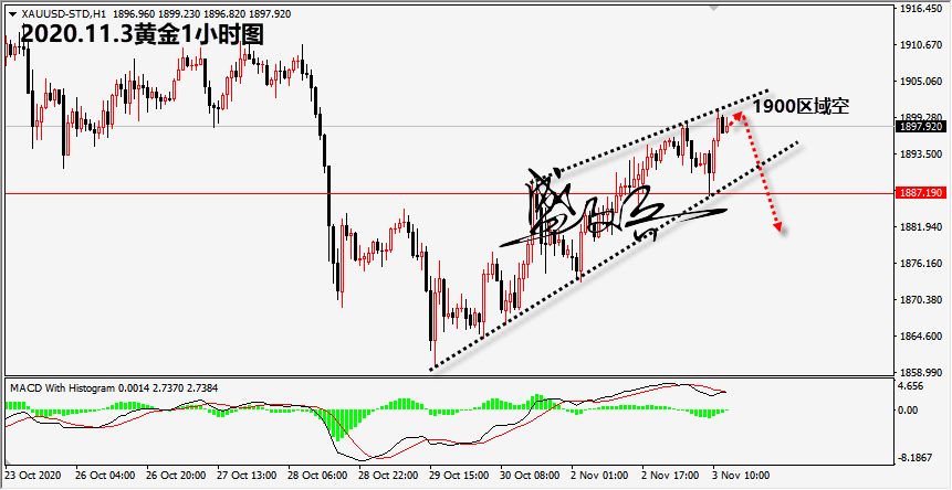黄金 今日欧洲股市大幅的反弹回升,市场对于肺炎疫情引发的担忧情绪得到极大的缓和,风险情绪在一定程度上降温。美元指数大幅的回撤,支持黄金继续攀升。接下来市场将重点关注美国大选结果。 黄金欧盘初在1887一线获得支持后大幅的回升,最高触及1900一线。从形态来看,金价仍然处于楔形收敛形态