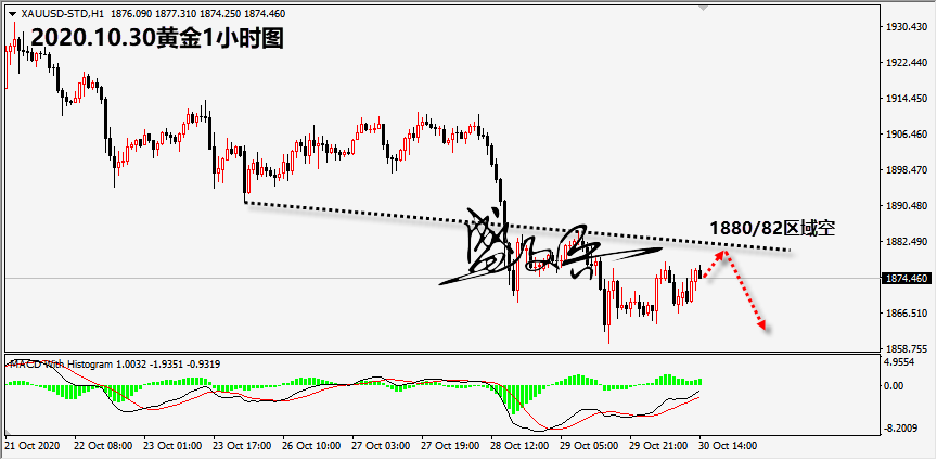 黄金 欧元区公布的三季度GD初值数据,尽管数据好于市场的预期,但是经济增持还是呈现负增长,数据对黄金的影响相对较校晚盘重点关注美国经济数据以及美股走势对于黄金的影响。 黄金白盘正如预期笔者预期,金价在1878位置承压后产生一波下跌只1866一线。只要参与这波空头行情这,至少有10美元的空