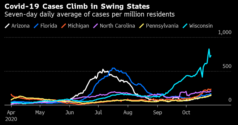 10月28日(周三),市场分析师arkiqutt和JoathaLvi撰文称,新冠感染人数激增给特朗普的竞选策略带来风险,因为很多支持共和党的选民可能放弃投票。瑞信称,民主党在美国大选中大胜的的话,将引发积极的新兴市场反应;基金公司也认为,特朗普下台可能性很大,他们已经采用了一系列相应对策,包括购买价值股、