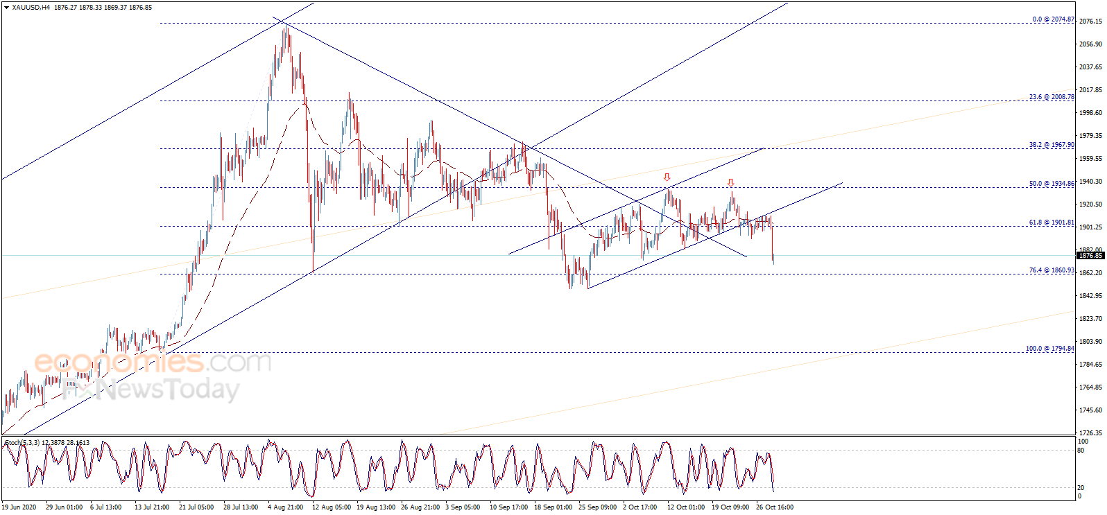 周四(10月29日)亚市早盘,现货黄金略微反弹,金价现报1879美元/盎司附近;金价周三大跌逾30美元。知名财经网站cooi.co最新撰文,对金价后市走势进行分析。 因没有迹象显示美国即将出台任何财政刺激措施来缓解新冠疫情对经济的冲击,投资者纷纷买入美元,现货黄金周三收盘大跌30.66美元,收报1876.83美元/