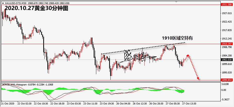 黄金 今日午后,一则消息燃爆市场,俄罗斯第二种新冠肺炎疫苗已开始投产,这使得投资者对于近期蔓延的疫情看到希望,市场风险情绪缓和,黄金大幅的下挫。晚盘重点关注美国经济数据和美股走势对于黄金的影响。 黄金完全符合笔者今日的预期,金价刚好在1910.3一线承压后下跌,今日笔者明确给出在191