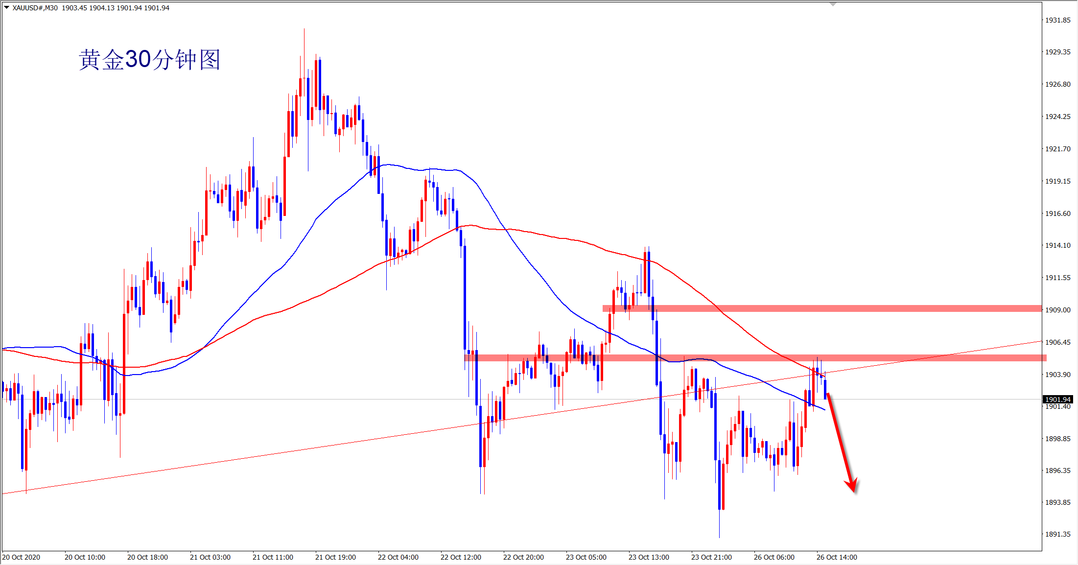黄金日内整体波动幅度有限,欧盘虽然拉升反弹,但是最终也未能突破今日早盘高点1904的阻力,更不用说1908多空分水岭阻力位置,此压力位置下依然持空看跌不变,美盘关注1890支撑,破位必然大跌! 认准一个方向,守住一个点,只要中途不下车,最终将会抵达目的地!上方1908就是我们最后的防线,交易就是打仗,没