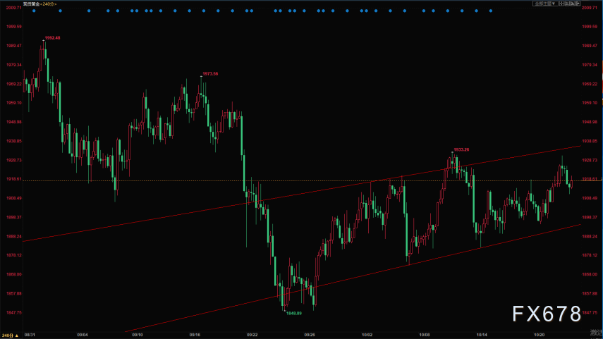 周四(10月22日)欧市盘中,现货黄金继续交投在1920美元下方,日内一度下探1910附近,白银也徘徊在25美元之下,原油价格维持升势。 针对日内黄金、白银及原油价格走势,瑞讯银行撰文进行简要分析,内容如下: 黄金:预期目标1897.00 转折点:1926.00 交易策略:在1926.00下方保持看空,目标