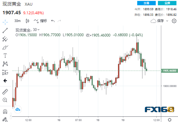 金价周一(10月19日)一度上涨约1%,因美元走软,且市场预期美国将在11月总统大选前达成经济刺激协议,这增强了黄金作为通胀对冲工具的吸引力。 美市盘中,现货黄金上涨近0.5%,现报1907.45美元/盎司,较稍早触及的日高1918.46美元/盎司回落逾11美元。 luLiFutur首席市场策略师hillitril表示,