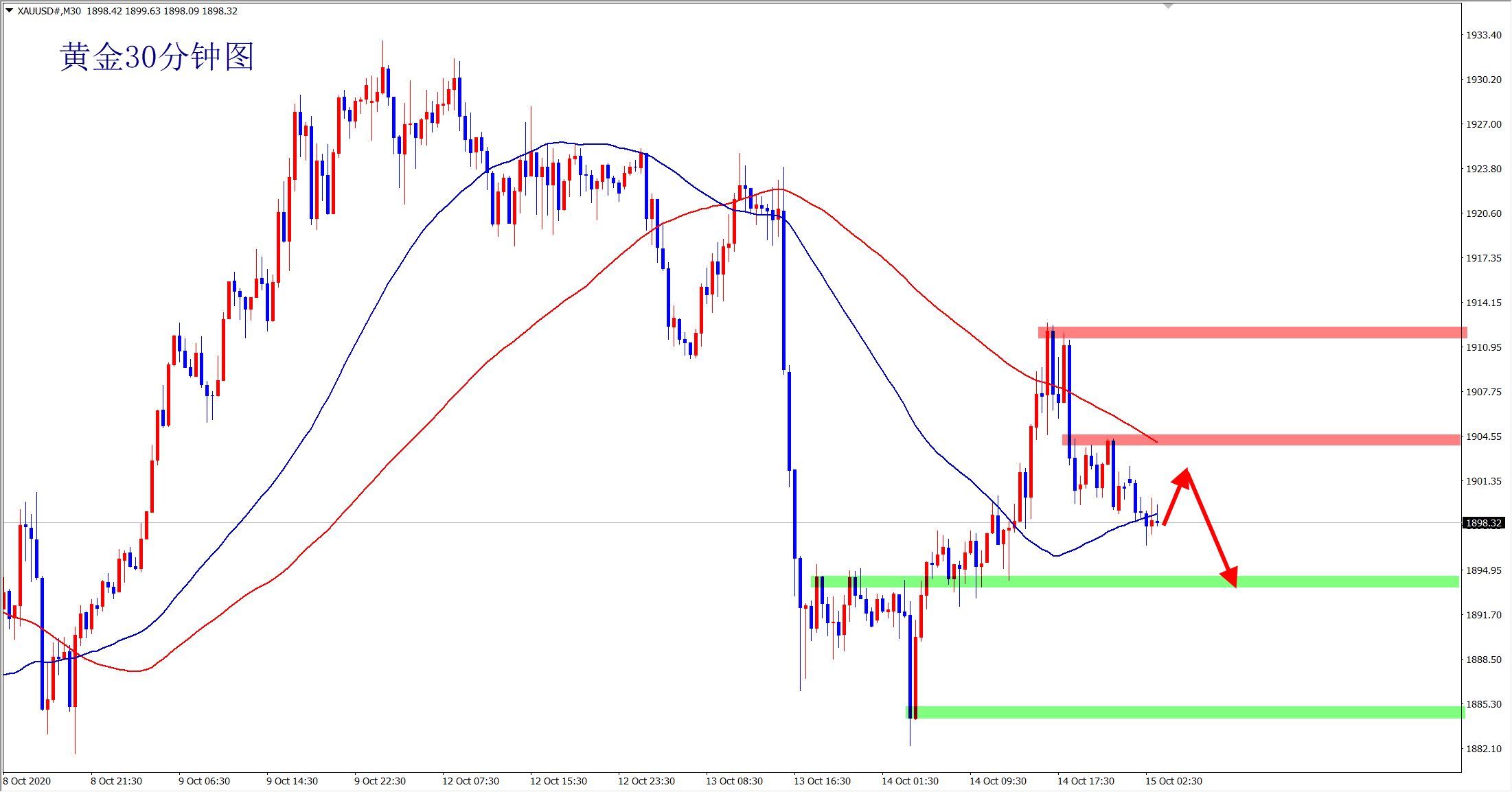 黄金欧盘1901现价空,如期跌至1890,收割一波,随后行情拉升,短线继续维持震荡,长时间的震荡只是再次选择方向前的准备,而现在明显的空头走势,加之今晚周初请数据公布,消息面刺激技术走势,必然是跌,美盘继续关注1902位置压力,此位置下继续空,破位只是时间问题! 黄金从1933位置下跌,昨日虽然强势拉升
