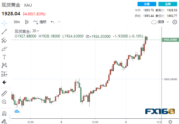 金价周五(10月9日)上涨超过1%,连续第二周上涨,原因是美元走软,以及有关美国经济刺激措施的新一轮谈判促使投资者购买黄金以对冲通胀风险。 美市盘中,现货黄金涨势扩大至逾1.8%,刷新日高至1928.55美元/盎司,较日低大幅拉升近36美元。美元指数下跌0.5%,日内最低触及93.11。 独立分析师Roihar指出
