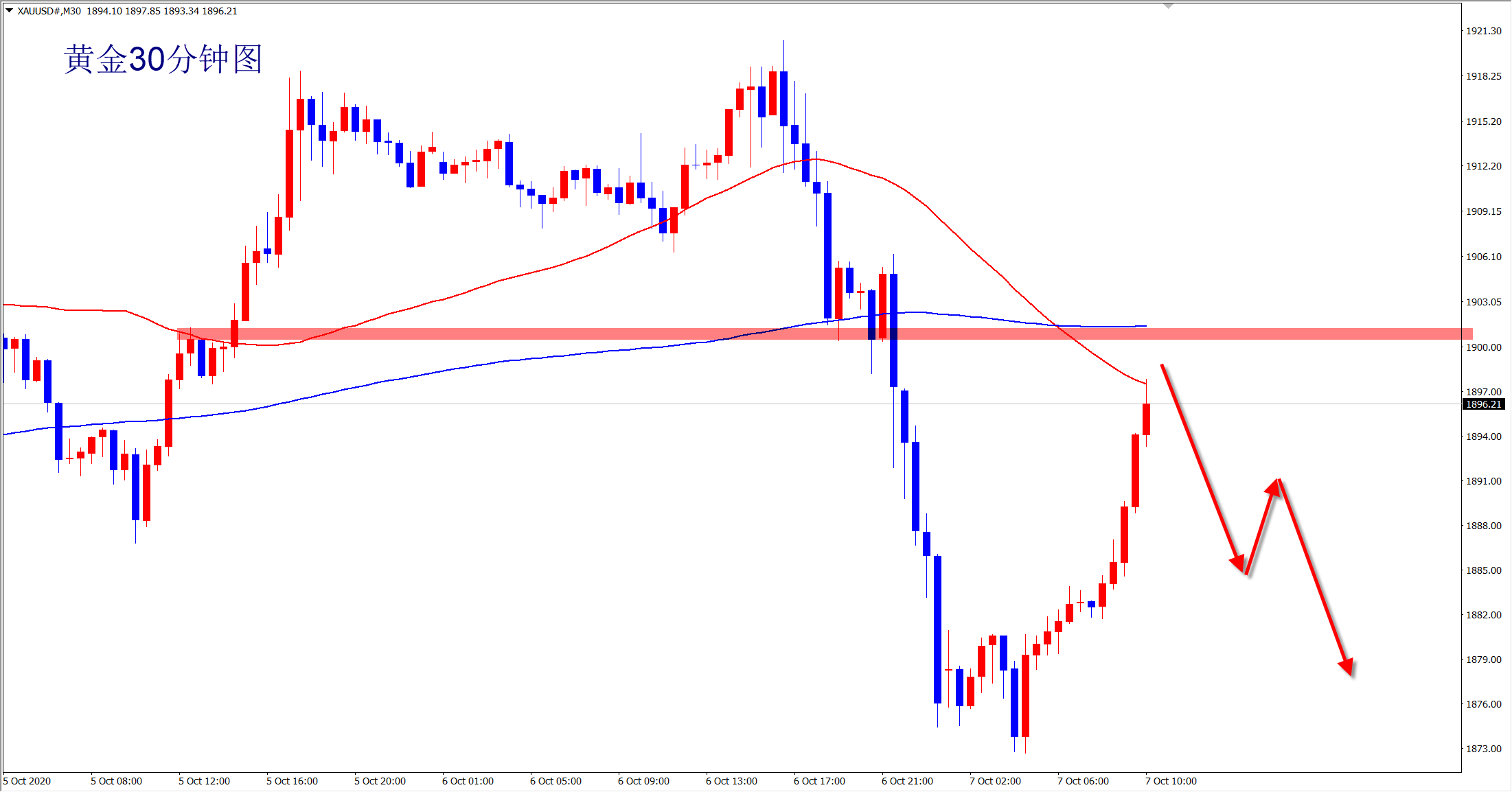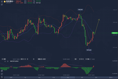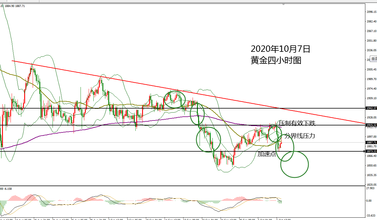 黄金周一在美国总统出院的消息推升下探底回升走高攀升1918.5区域。 周二美盘前延续反弹走高直至22点上探至1921区域,随后美国总统一句放弃经济援助计划直至大选结束,黄金美股全线下挫放量走低。 黄金承压回落走低,午夜时段下探至1898,反弹确定阻力1906继续放量走低至1874,今日周三早盘延续走低破低18