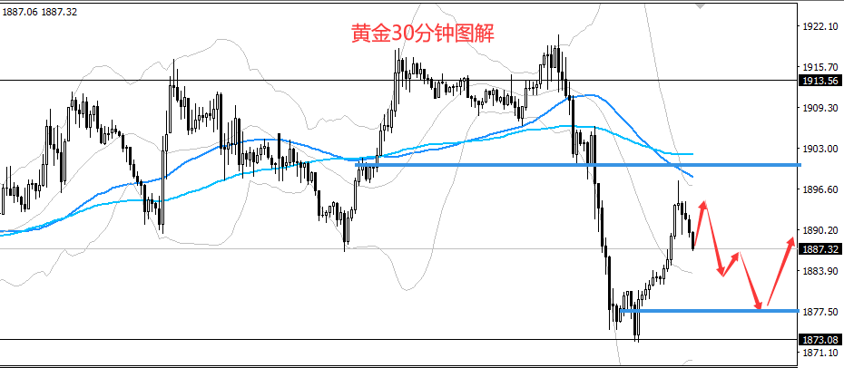 黄金出现强劲反弹,原计划上方的阻力是1890,目前是一举突破,阻力无效,这种强劲反弹已经把下跌趋势破坏,此种走势下不能过早的去参与空单 从当前来看,目前上涨暂时还没结束,估计很多人都在等着去做空,这里要注意:看浪型,只要这种反弹浪没有走完,切记不可做空,待到走完之后再做空才是最安全的。