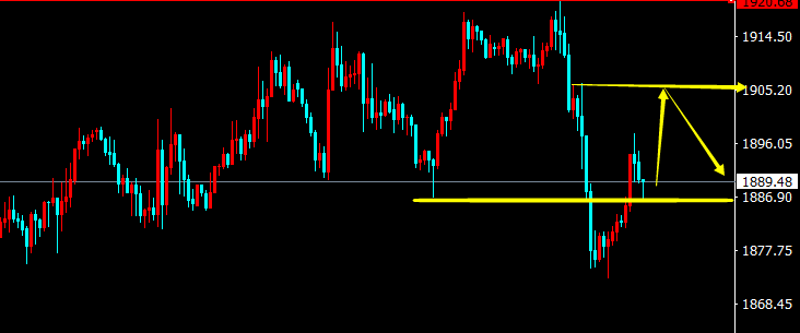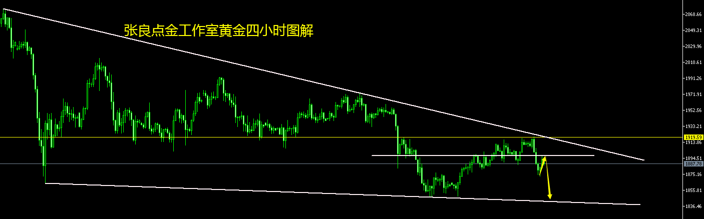 反弹不是反转!坚持看跌!1992已空! 隔日大跌后,今早探底1875反抽,午后强势反弹,一度触及斐波那契0.5位置1897一线掉头向下。整体而言,形态看跌并未改变,四小时反抽测试1897区域阻力后延续跌势。整体呈现阶梯式震荡下行格局。 欧美盘时段,继续依托1892一线空看跌为主,防守1899即可,下方看跌目标