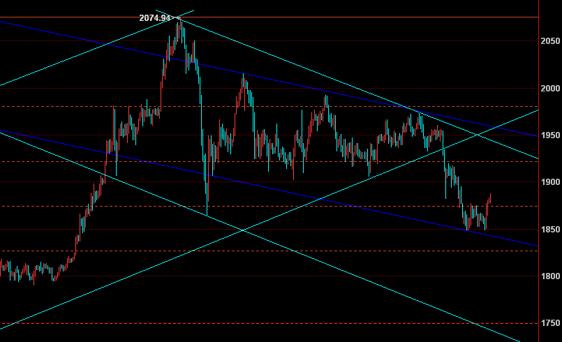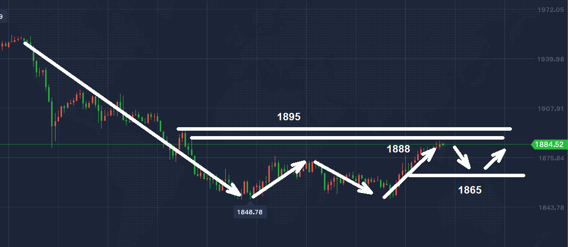 上周关于1848位置在月线A5及周线A20的支撑,及我们构建的如图下跌通道下轨趋势线下轨连线节点1848-50支撑也反复说过无数遍,周一早间1865位置短线压制回撤,但是最终1848的综合支撑位再次支撑金价上行,形态上在小周期成型小双底形态,目前上行1887我们短线目标,后面上破则需要看到1895及日线A10在1902的目标位,
