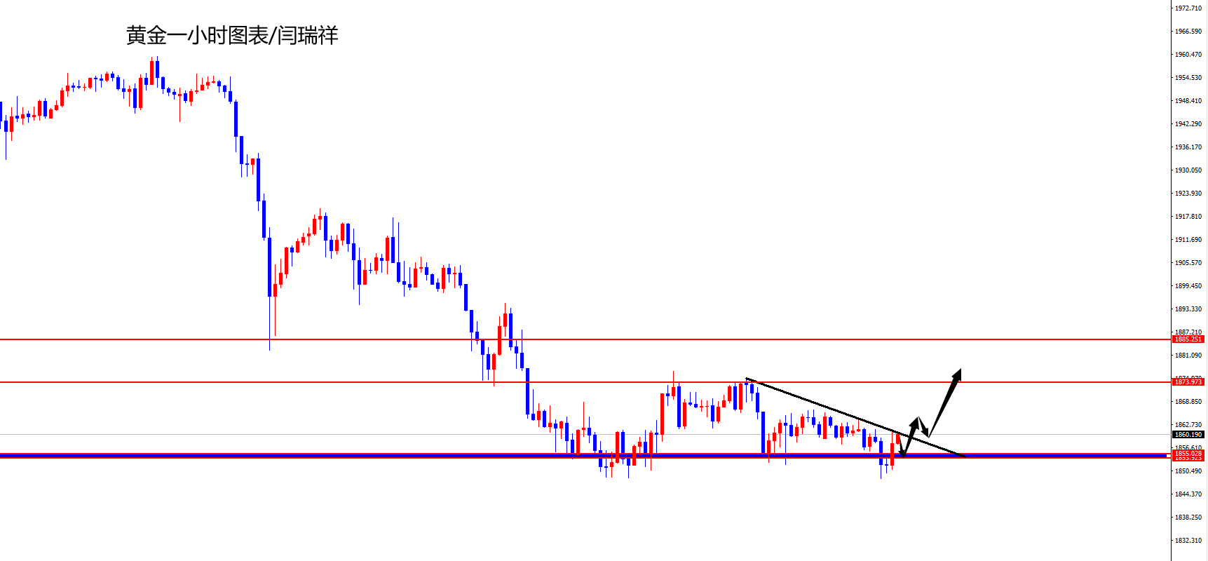 永远不要低估市场的力量,保持敬畏与机敏,各位好。 黄金今天白盘整体波动不大,欧盘期间再次向下测试1848关口,但仍然没有突破,随后黄金终于在欧盘后期时段开始有了点波动,连续四小时上拉26美金,最高打到1877美元,随后遇阻回调,这波连续的上涨不知道有没有沉不住气开始心慌?其实大可不必,还记得白天跟