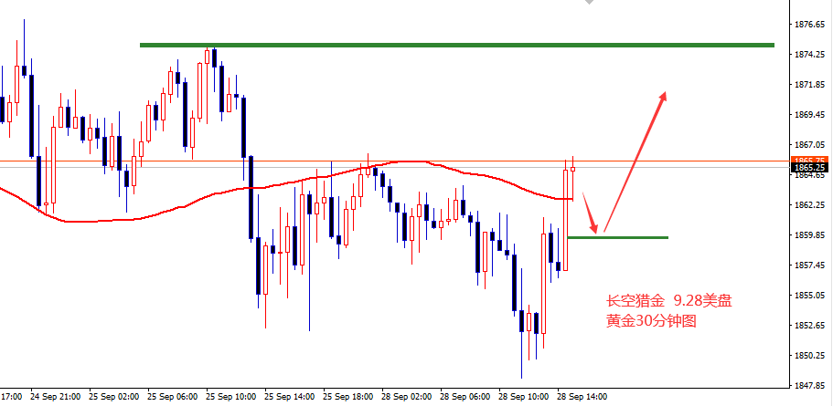 我们一起来看下晚间行情: 1,日内如预期,刚好遇阻1863一线下跌,且时间点出现在欧盘,价格最低到1849,空单拿下10美金+ 2,行情也如预期,5-8点反弹了,但却出乎意料,价格继续到1861上方,基本上走了V型。 3,这也就意味着连锁反应,价格在1850再次获得支撑反弹,这和早间预期的不一样,早间我