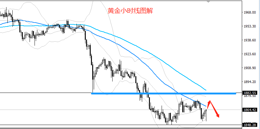 23点,晚间行情虽慢,但依然不影响整体预判的节奏,黄金1862一线空单顺利获利出局。 在日内方面由于昨日探底回升所以我们没有出手,而是等待欧盘走势过后美盘做跟随交易,可以看到欧盘向下跌破分水岭1861.5一线,这就意味着晚间至少有一次回落,但是由于小时线三连阳形态,长时间的震荡之后不能再去看破底,184