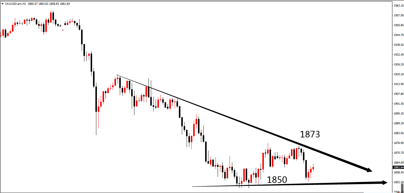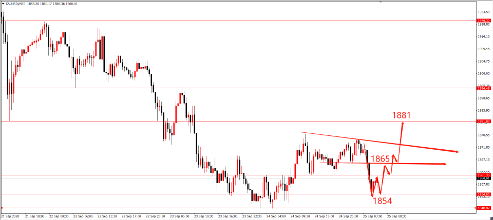 日内方面我们选择了观望,主要在于昨天晚间的探底回升打断了短线极弱的形态,另外早间二次测试凌晨回踩的低点反抽,做多做空都是五五开。 欧盘走势过后美盘做跟随交易会较为轻松,日内没有突破昨天高点1877一线,反而是向下承压回落跌破1861.5,这把短线行情再度拉入偏弱形态当中,所以美盘还有向下回撤的空间