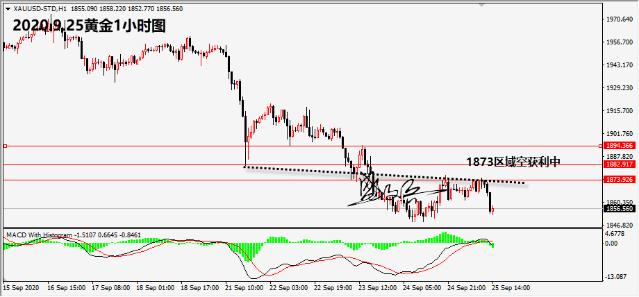 日内虽然不是欧盘开盘初期下跌,但也在美盘前回撤。 几个注意点: 1,欧盘回撤破掉日内第一次低点。 2,7-8点反弹修正。 3,4小时大阴线。 这就意味着分水岭1873明确。而晚间如果做续跌,其实也不难,需要注意两个方面就可以。 既然欧盘下跌破早间低点,那么美盘反抽空一次即可