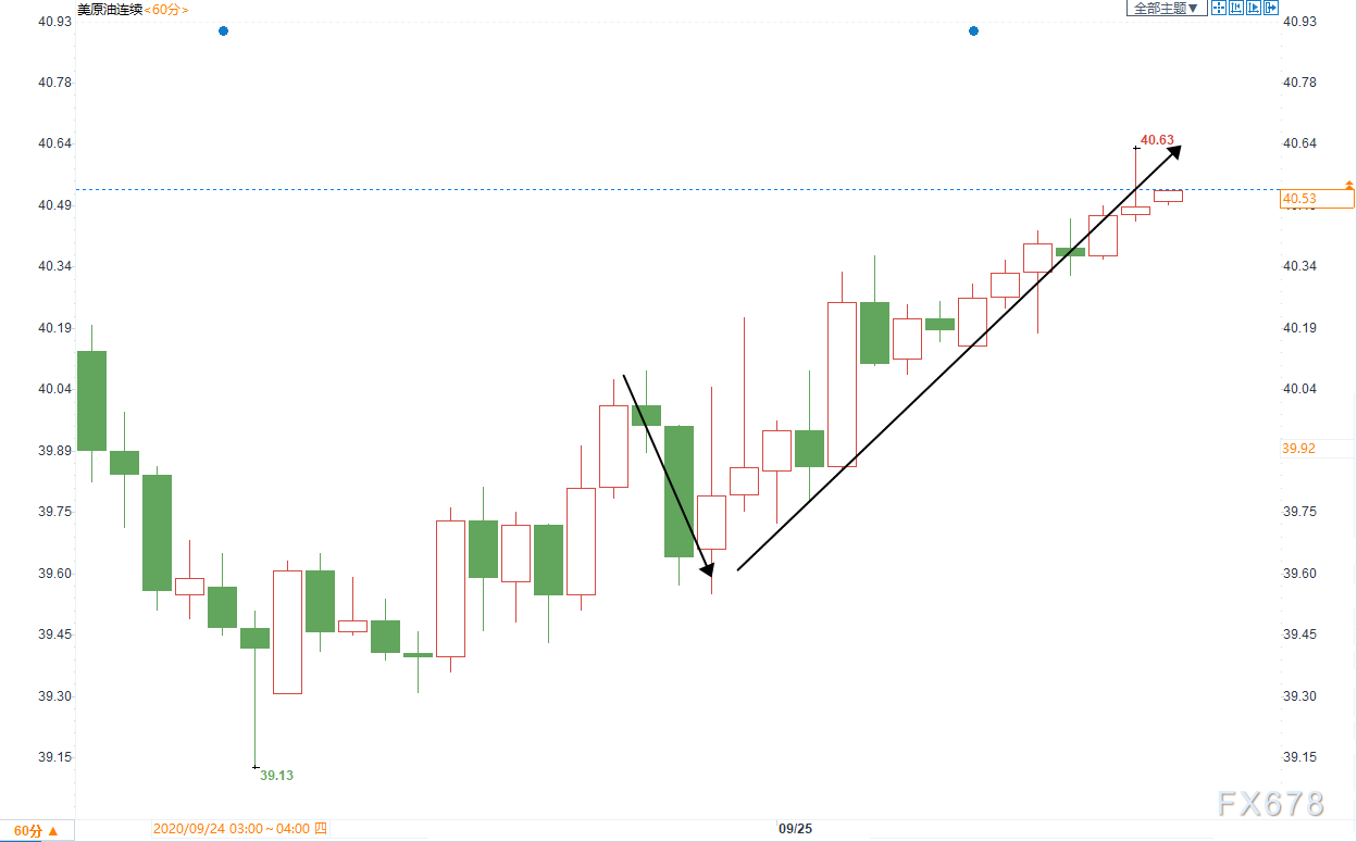 周五(9月25日)美原油小幅走高,盘中刷新两个交易日高位于40.64美元,现报40.48美元,涨幅0.42%。 周四因为市场押注美国出台新的刺激计划,因此油价反弹。在此之前,美国失业金数据不佳一度小幅打压油价,但是因市场押注这将加大美国出台财政刺激的压力,因此油价随后快速反弹。 总体而言,油价目前仍在