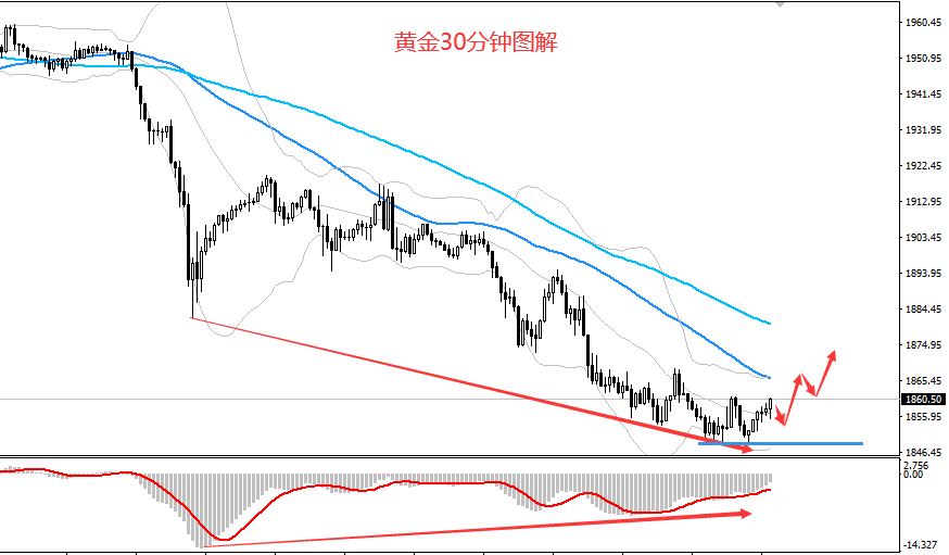 现货黄金自1970一线开始下跌,王导一路做空下来,一路走一路跌,一直跌到1850一线,早晨再次在1868进场防控,1850获利,再度收割一单。 技术层面上,尽管日线布林线开口打开,但是K线远离均线;4小时级别,K线同样远离均线,技术上必有修正。此外,重要的是小时线级别,K线和ACD指标呈现底背离现象;30分钟级