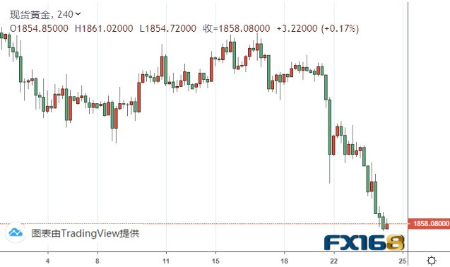 周四(9月24日)亚市早盘,现货黄金继续承压,目前位于1858美元/盎司附近。知名财经网站cooi.co撰文,对金价后市走势进行分析。 因美元继续走强,金价周三重挫,创下两个月来的最低收盘点位。现货黄金收报1863.05美元/盎司,下跌35.76美元或1.88%,盘中最低触及1855.00美元/盎司。 cooi.co在文