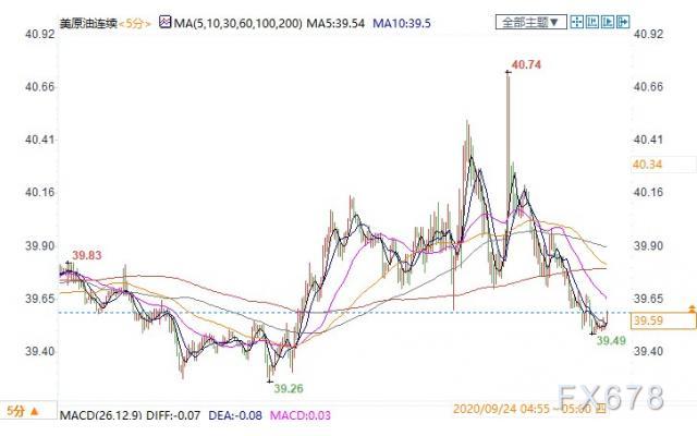 【市场盘点】 油市方面,WTI原油亚盘期间震荡走低,欧盘初涨至40美元上方,后有所回落;美盘期间WTI原油一度涨至40.69美元的日高,但尾盘持续回落。最终收跌0.05%,报39.56美元/桶。布伦特原油收跌0.65%,报41.49美元/桶。 【原油行情分析】 原油短线继续陷入震荡当中,凌晨虽然行情有所反弹至40.7