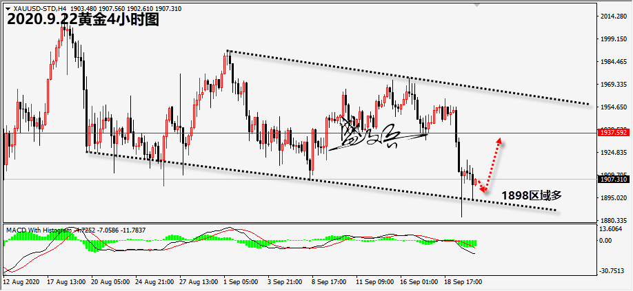 今日美盘行情分析: 黄金在欧盘震荡下行,最低触及1895附近后震荡反弹,并未在欧盘下破昨日低点,今天行情很有可能就是震荡修正了,我们在盘中给出了1901-02激进多单,先持有看美盘怎么走。 晚上美盘没有太多分析的,重点就关注早盘反抽的高点1920位置,这个位置是美盘强弱分水岭,此位置不破,偏弱走势