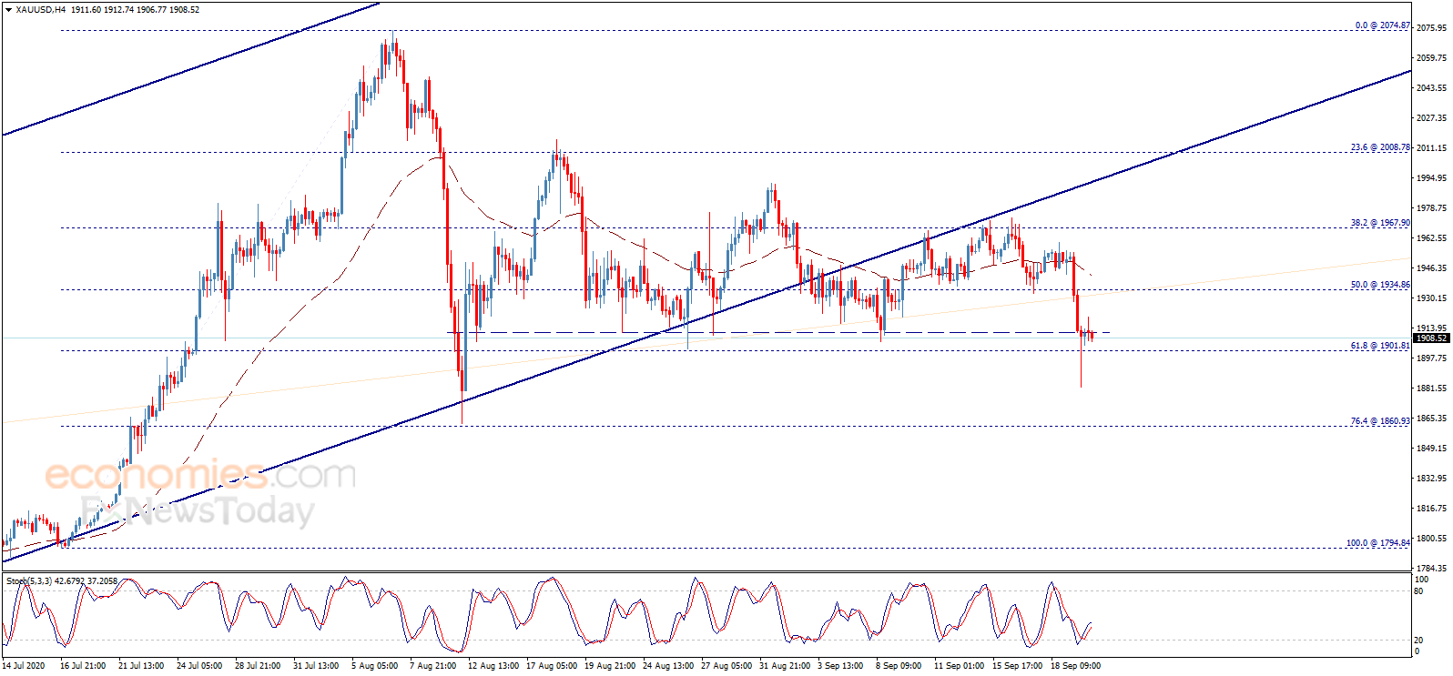 周二(9月22日)亚市盘中,现货黄金继续承压,金价现报1911美元/盎司附近;周一因美元走强,金价大幅下挫。知名财经资讯网站cooi.co周二最新撰文,对日内黄金走势进行前瞻分析。 cooi.co在文章中写道,金价昨日面临强劲的看空压力,并尝试跌破1901.80美元/盎司,技术走势形成看空形态,这暗示金价将