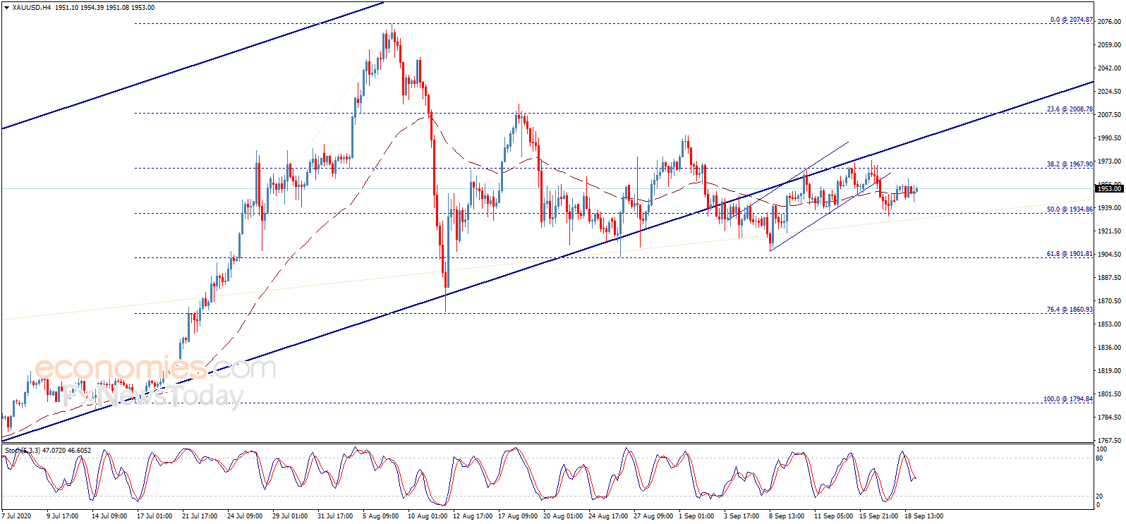 周一(9月19日)亚市盘中,现货黄金维持升势,金价现报1953.50美元/盎司附近。知名财经资讯网站cooi.co周一最新撰文,对日内黄金走势进行前瞻分析。 cooi.co在文章中写道,从4小时图来看,金价徘徊在A50指标附近。值得注意的是,随机指标试图获得正面动能,等待这一因素推动金价继续主要看涨趋势,