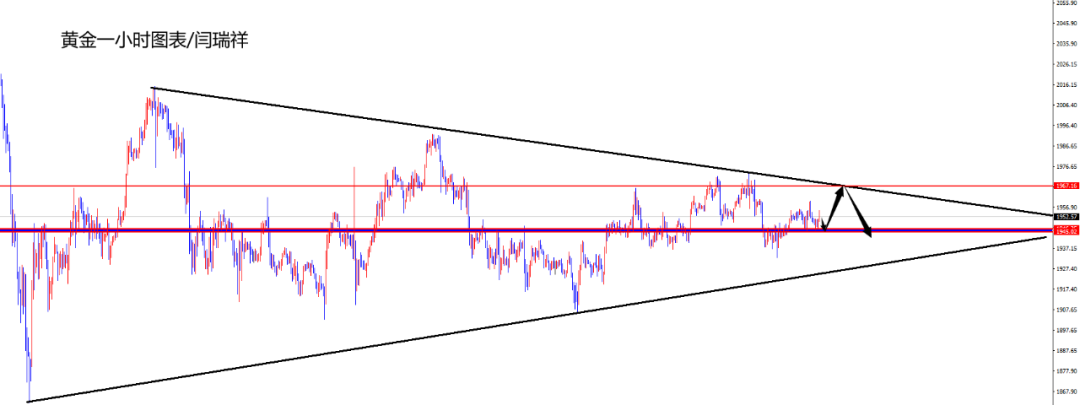 今日亚欧盘行情分析: 周评中给大家详细分析过目前的行情,目前行情属于三角破位后的回踩测试,测试完毕会直接拉升,所以操作上,主多副空。只要回踩不破上升三角整理,那么三角整理结构成立,后市看涨。 上方短线压力在1960周五反抽的高点位置,下方短线支撑在1945-46尾盘起涨点位置,同时1945-46是日线