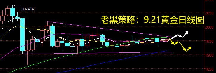 9.21黄金分析策略: 上周黄金围绕在1950上下震荡多日,周线最终收得一带有上影线的小阳星线,收于5、10周均线附近,如此形态并不能给未来波段级别走势指引方向,反倒增加不确定风险。 日线结构上,黄金上周基本是围绕1950上下运行的,处于均线带内运行,也处在预期的三角区间内运行,三角上沿压力虽有测