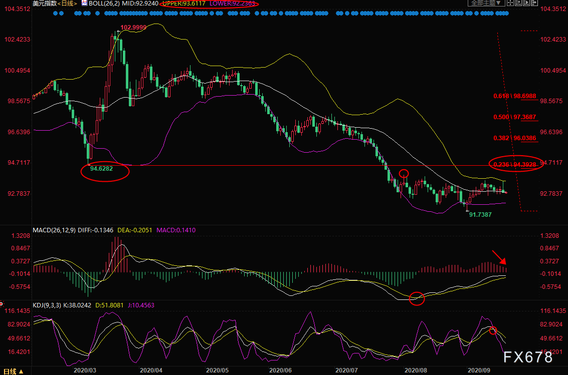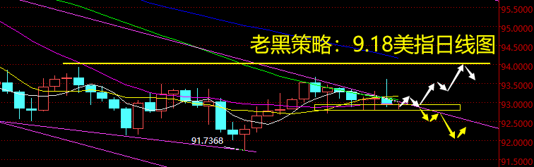 9.18外汇、黄金、原油分析策略: 【美指】 美指昨日先延续震荡走高,测压至前期小高点93.6附近,随后行情持续震荡回修,后半夜美指再度跌破93一线,致日线收得一带有长上影线的小阴星线,日线结构再次变得复杂难辨。 今日早间美指下撤至92.8附近,但未有跌破,目前虽有止跌回弹,然实际上涨