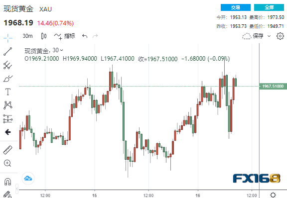 金价周三(9月16日)上涨,因美联储将公布政策,预计美联储将重申温和的货币政策立场,以支持经济从冠状病毒危机中复苏。 美市盘中,现货黄金短线一度自9月2日以来最高水平1973.16美元/盎司下滑17美元至1956.45美元/盎司,随后自低位迅速反弹至1970美元/盎司关口略下方,短线走出V型反转行情。 HighRidgFu