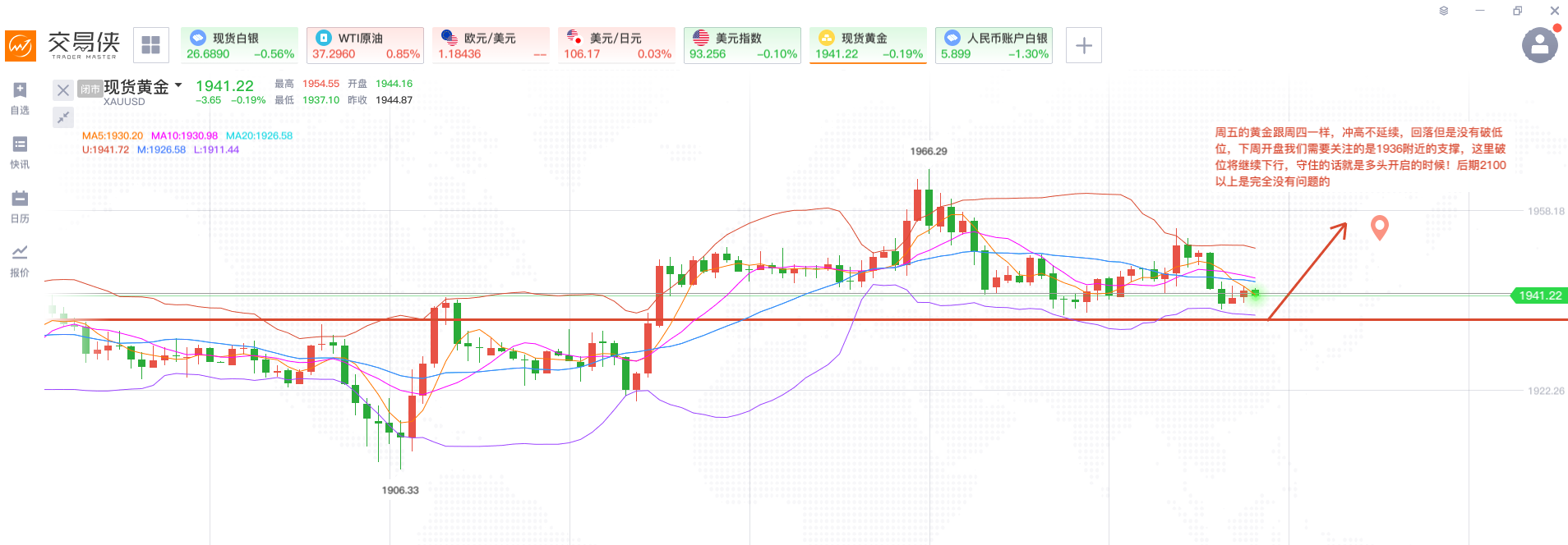 周一1943-1945分批做空,日内最低到达1916一线 周二1930-1933分批做空,日内最低到达1906一线 周三1923做多,亚盘到达1935一线,以及1933-1935反手分批做空,晚间到达1920一线 周四给出1947做空以及1940做多,但日内最低1941.2,最高1966 周五给出1946一带做空止损之后,晚间拉高1955,空单