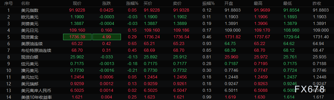 周三(3月17日),国际金价走强,逼近上个交易日录得的3月1日以来高位1741.20美元/盎司,短线仍上看1762美元。但美元和美债收益率持坚限制了金价涨势,投资人关注美联储政策会议结果。 现货黄金上涨0.31%至1736.83美元/盎司;COX期金主力合约上涨0.26%至1735.3美元/盎司;美元指数上浮0.04%至91.914;美债收益率运行