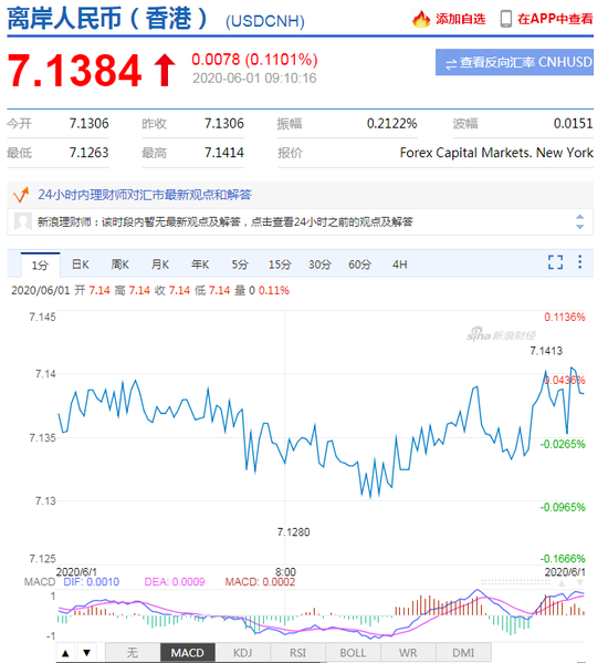 6月1日,美元指数(98.1056-0.1659-0.17%)短线下行,人民币(7.13650.00010.00%)中间价报7.1315,上调1点,上一交易日中间价报7.1316,在岸人民币上一交易日收报7.1455。 美元指数短线下行 联储模型预测美国二季度GD腰斩 亚特兰大联储GDow对于美国第二季度的GD增长率预测为降51.