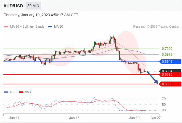 周四(1月19日)盘中,澳元/美元暂报0.6889,跌0.0044,跌幅0.63%。 澳元/美元汇率今日分析:在0.6945之下,看跌,目标价位为0.6890,然后为0.6850。在0.6945上,看涨,目标价位定在0.6975,然后为0.7000。 技术点评:只要0.6945阻力位不被突破,向下跌破0.6890位置的风险