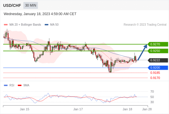 周三(1月18日)盘中,美元/瑞郎暂报0.9234,涨0.0015,涨幅0.16%。 美元/瑞郎汇率今日分析:在0.9200之上,看涨,目标价位为0.9250,然后为0.9270。在0.9200下,看空,目标价位定在0.9185,然后为0.9170。 技术点评:RI技术指标上,看涨。 阻力位:0.92000.91850.