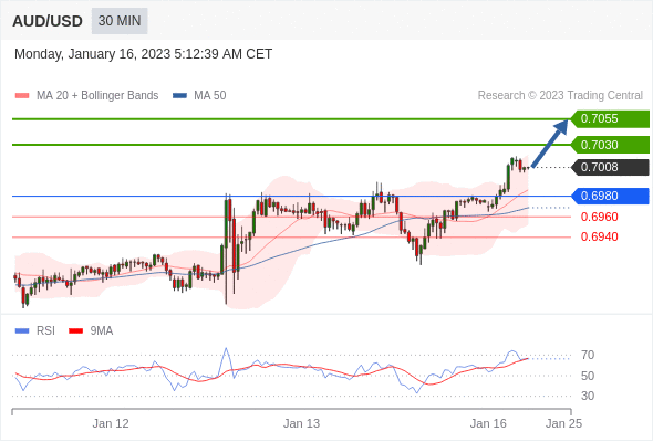 周五(1月13日)盘中,澳元/美元暂报0.6952,跌0.0012,跌幅0.17%。 澳元/美元汇率今日分析:在0.6980之上,看涨,目标价位为0.7030,然后为0.7055。在0.6980下,看空,目标价位定在0.6960,然后为0.6940。 技术点评:RI技术指标缺乏下降动能 阻力位:0.69800.69600.6