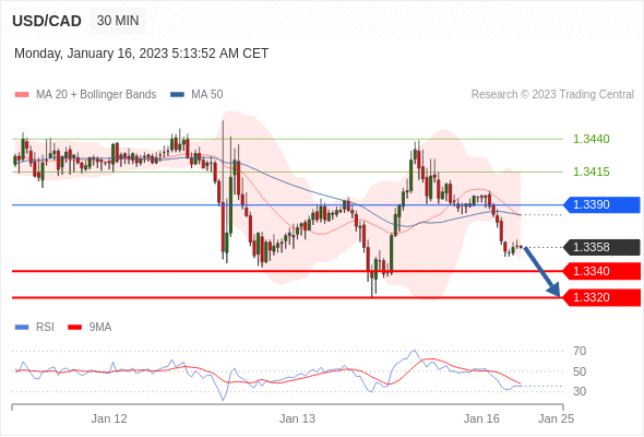 周一(1月16日)盘中,美元/加元暂报1.3368,跌0.0024,跌幅0.18%。 美元/加元汇率今日分析:在1.3390之下,看跌,目标价位为1.3340,然后为1.3320。在1.3390上,看涨,目标价位定在1.3415,然后为1.3440。 技术点评:跌破1.3340位置,将会引发下跌至1.3320。 阻力