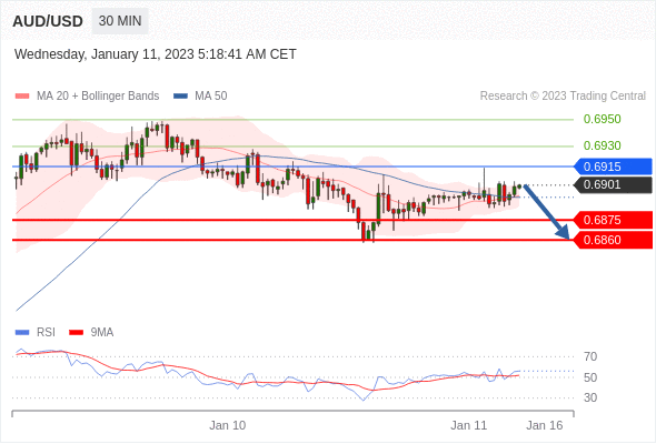 周二(1月11日)盘中,澳元/美元暂报0.6923,涨0.0035,涨幅0.51%。 澳元/美元汇率今日分析:在0.6915之下,看跌,目标价位为0.6875,然后为0.6860。在0.6915上,看涨,目标价位定在0.6930,然后为0.6950。 技术点评:上升的空间可能被0.6915阻力位所限制。 阻力位:0.69500.6