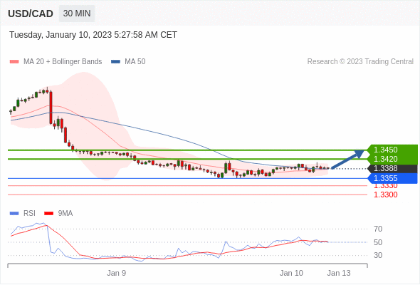 周一(1月9日)盘中,美元/加元暂报1.3381,跌0.0007,跌幅0.05%。 美元/加元汇率今日分析:在1.3355之上,看涨,目标价位为1.3420,然后为1.3450。在1.3355下,看空,目标价位定在1.3330,然后为1.3300。 技术点评:1.3355附近形成了一个支撑的底部,将带来走势短期内的稳定。