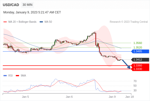 周一(1月9日)盘中,美元/加元暂报1.3398,跌0.0045,跌幅0.33%。 美元/加元汇率今日分析:在1.3485之下,看跌,目标价位为1.3360,然后为1.3330。在1.3485上,看涨,目标价位定在1.3520,然后为1.3560。 技术点评:RI技术指标跌破其30位置。 阻力位:1.33601.333