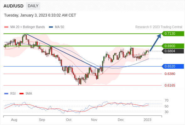 周二(1月3日)盘中,澳元/美元暂报0.6792,跌0.0005,跌幅0.07%。 澳元/美元汇率今日分析:在0.6520之上,看涨,目标价位为0.6900,然后为0.7130。在0.6520下,看空,目标价位定在0.6380,然后为0.6165。 技术点评:RI技术指标向上运行。 阻力位:0.72800.7