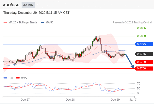 周四(12月29日)盘中,澳元/美元暂报0.6744,涨0.0006,涨幅0.09%。 澳元/美元汇率今日分析:在0.6775之下,看跌,目标价位为0.6720,然后为0.6700。在0.6775上,看涨,目标价位定在0.6800,然后为0.6825。 技术点评:跌破0.6775,为空头信号,向下的目标将会是0.6720。