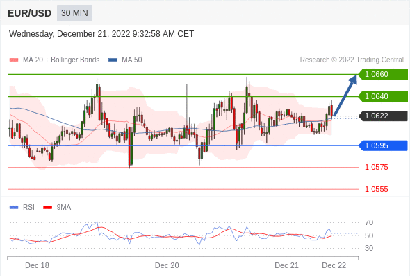 周三(12月21日)亚盘,欧元/美元上涨,暂报1.0625,涨幅0.04%。欧洲央行管委穆勒表示,下一次会议加息的速度不会放缓,预计欧元区将出现相对轻微的衰退。 欧洲央行最新动态: 欧洲央行管委维勒鲁瓦认为,欧洲经济可能会避免硬着陆。欧元区10月季调后经常帐录得-4.02亿欧元,为2022年2月以来最小