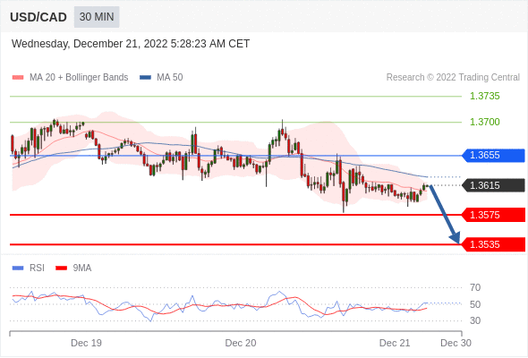 周三(12月21日)盘中,美元/加元暂报1.3611,跌0.0001,涨幅0.01%。 美元/加元汇率今日分析:在1.3655之下,看跌,目标价位为1.3575,然后为1.3535。在1.3655上,看涨,目标价位定在1.3700,然后为1.3735。 技术点评:跌破1.3575位置,将会引发下跌至1.3535。 阻力